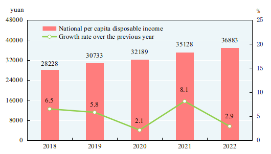 Figure 18: National Per Capita Disposable Income and Its Growth Rates 2018-2022
