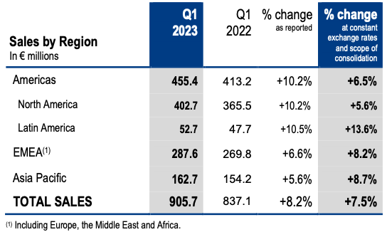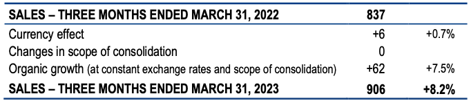 Consolidated sales totaled €906 million in the first quarter of 2023, up 8.2% from €837 million in the year©\earlier period. Organic growth (at constant exchange rates and scope of consolidation) stood at +7.5%, in line with expectations. Exchange rate movements resulted in a positive currency effect of €6 million, mainly reflecting a stronger euro versus the US dollar.