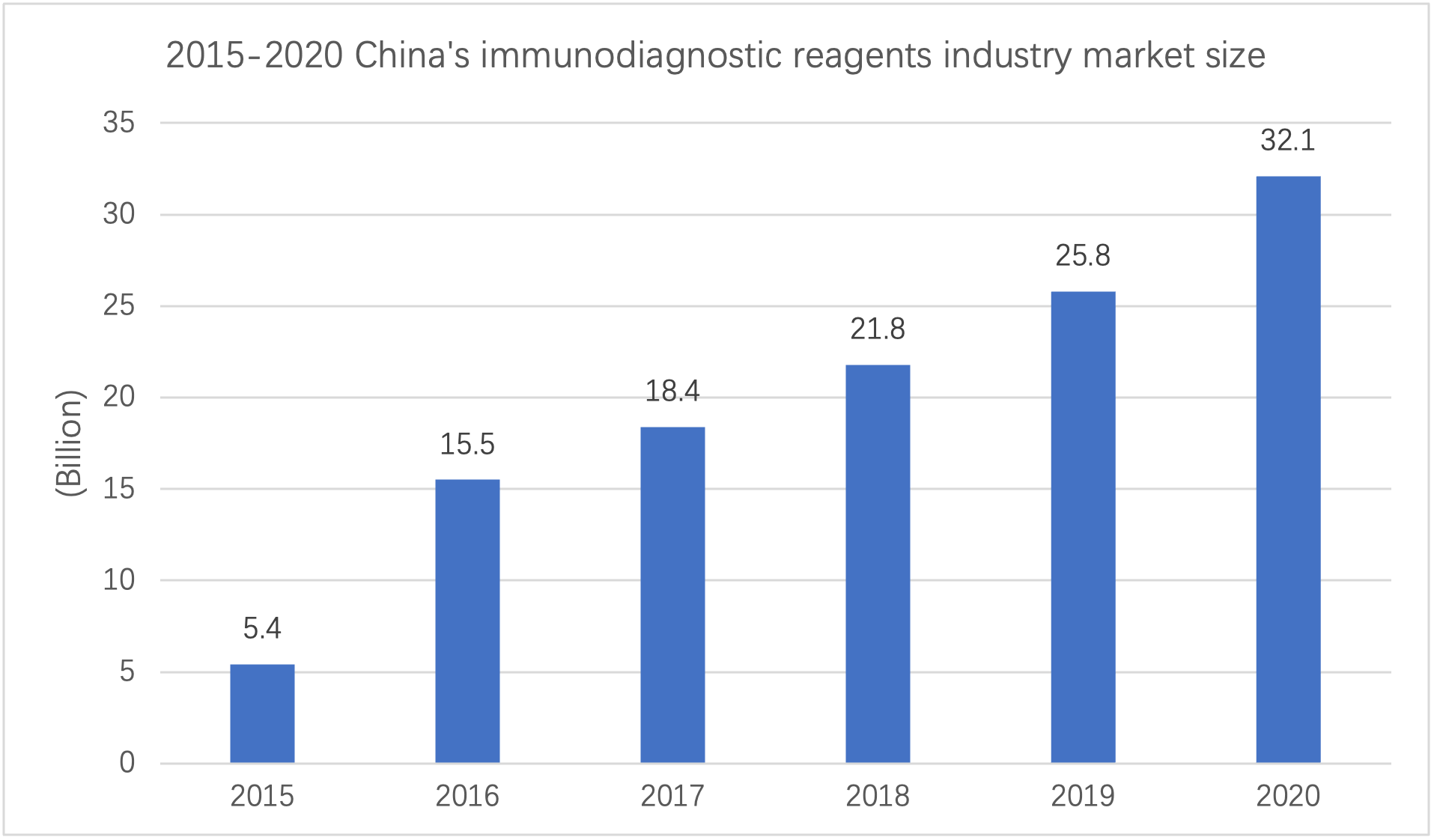 In recent years, the market scale of immunodiagnostic reagents in China has been increasing year by year. In 2020, the market size of China's immunodiagnostic reagent industry reached 32.1 billion yuan, an increase of 24.42% year-on-year.