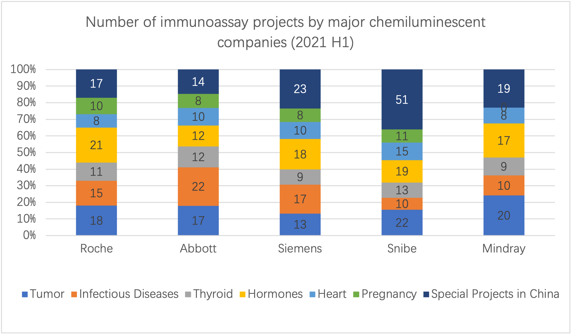 The leading domestic chemiluminescence immunodiagnostic companies include Snibe, AutoBio, Mindray, Maccura and YHLO. However, since the market share of a single company is not high, companies with core technology, high quality products and strong channel capability still have a lot of opportunities in this field.