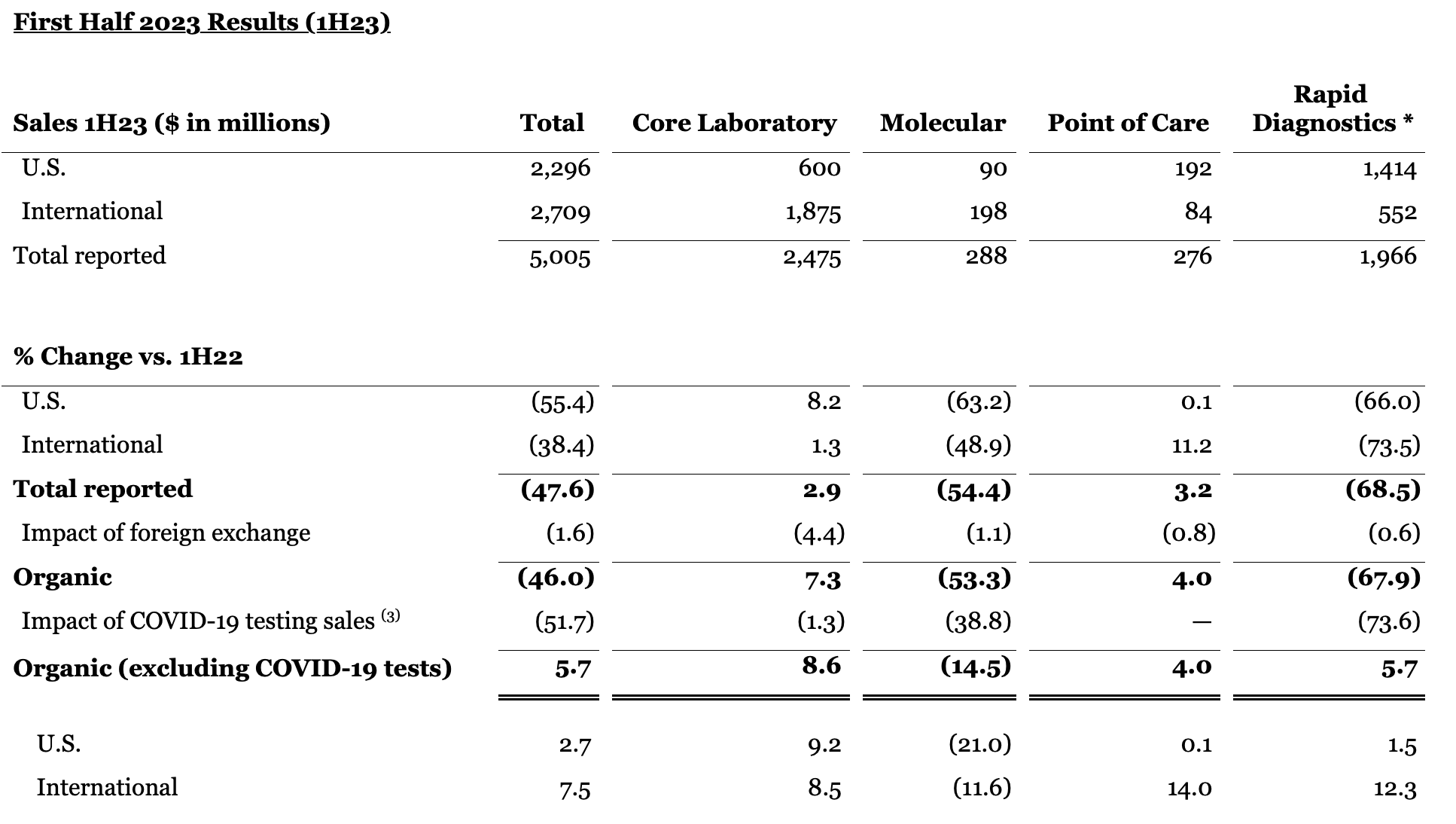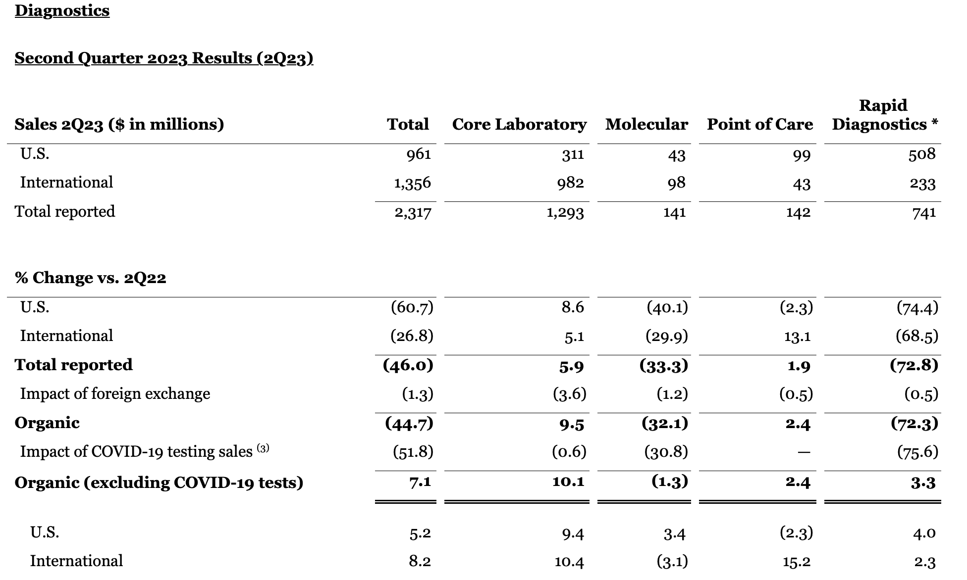 As expected, Diagnostics sales growth in the second quarter was negatively impacted by year-over-year declines in COVID-19 testing-related sales3. Worldwide COVID-19 testing sales were $263 million in the second quarter of 2023 compared to $2.324 billion in the second quarter of the prior year.