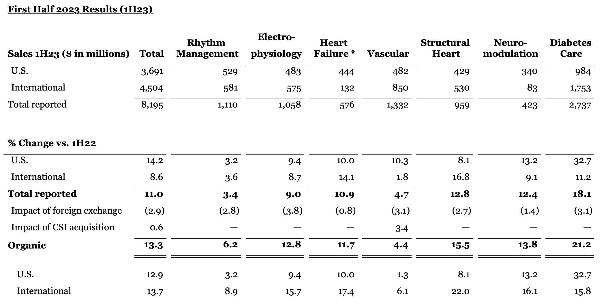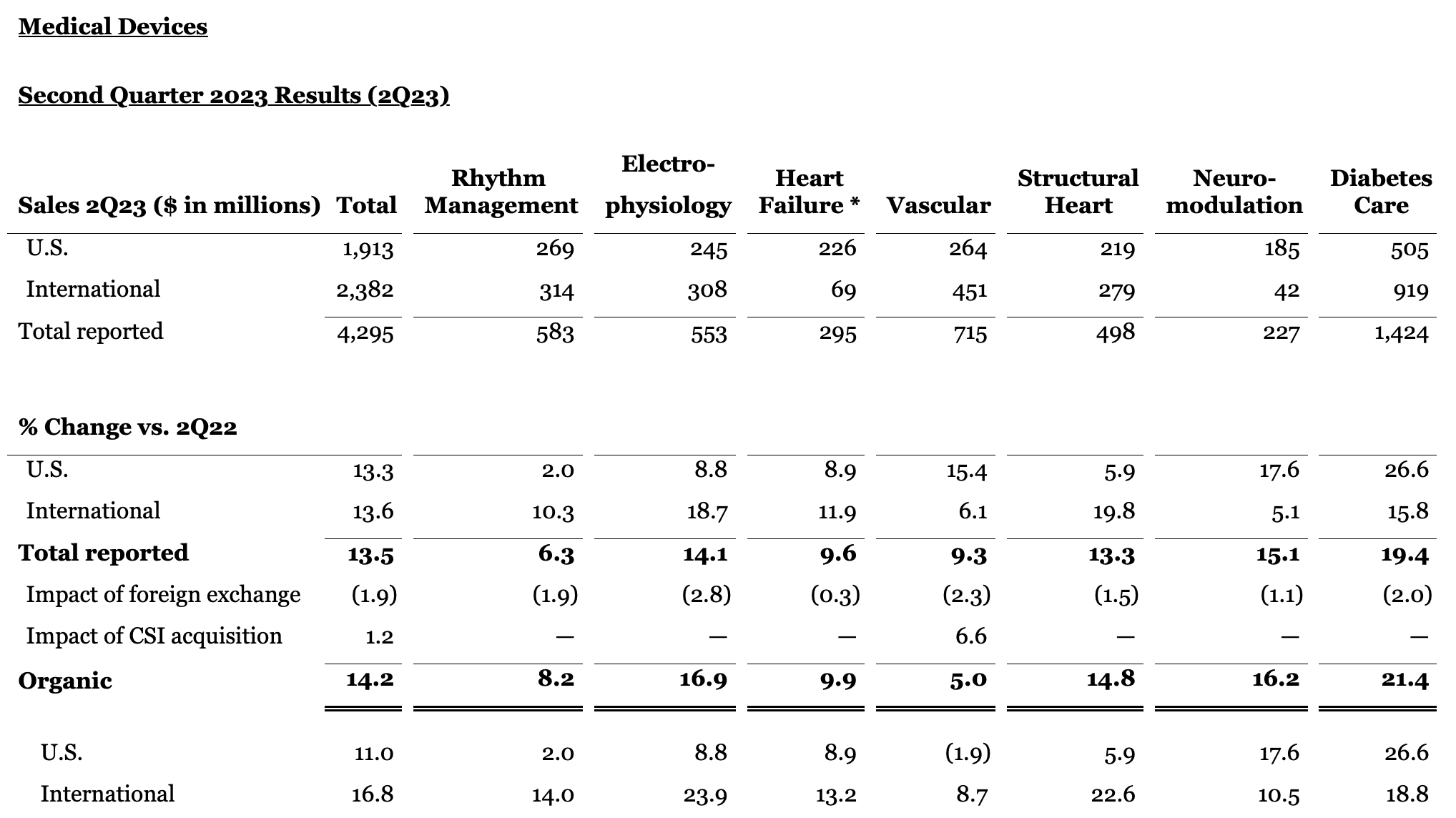 Worldwide Medical Devices sales increased 13.5 percent on a reported basis and 14.2 percent on an organic basis in the second quarter. Sales growth was led by double-digit organic growth in Diabetes Care, Electrophysiology, Structural Heart and Neuromodulation. Several recently launched products and new indications contributed to the strong performance, including Amplatzer® Amulet®, Navitor®, TriClip®, and Aveir™.