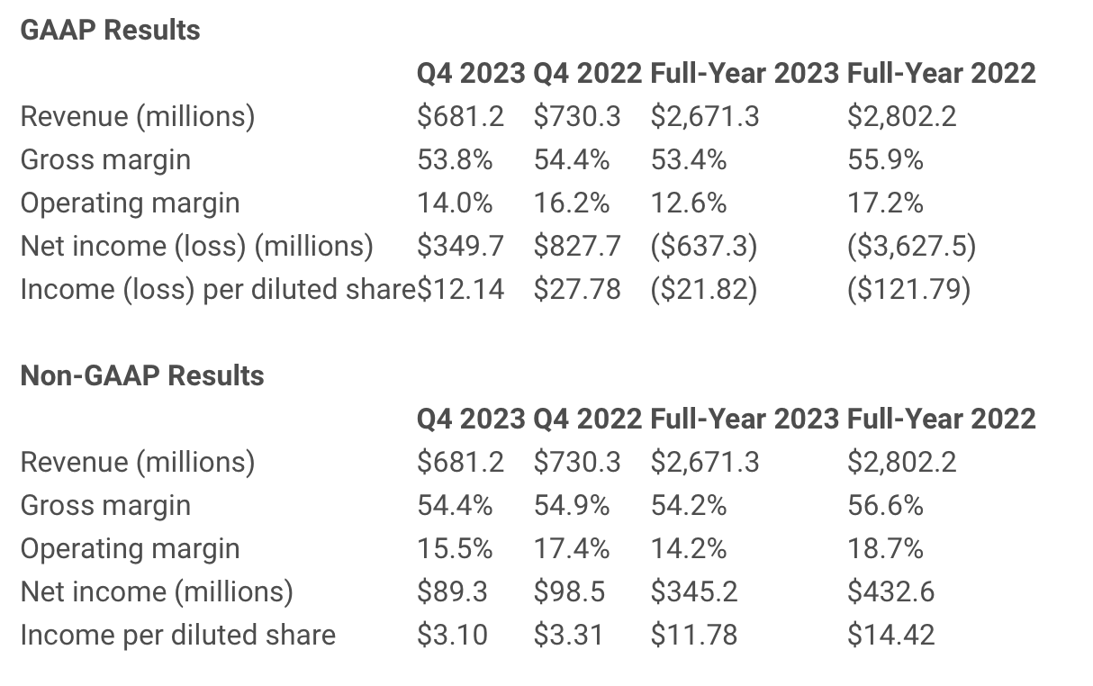 Non-GAAP gross margin was 54.2 percent for full-year 2023 compared to 56.6 percent for full-year 2022.