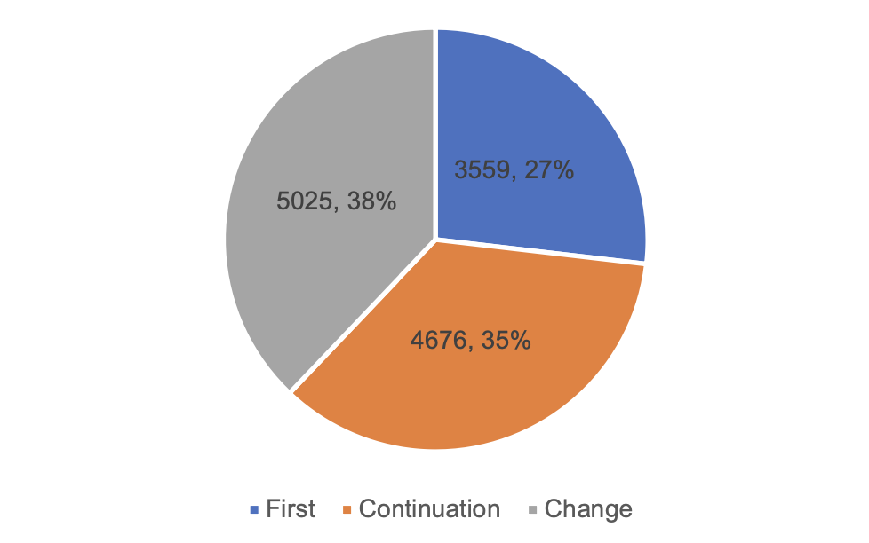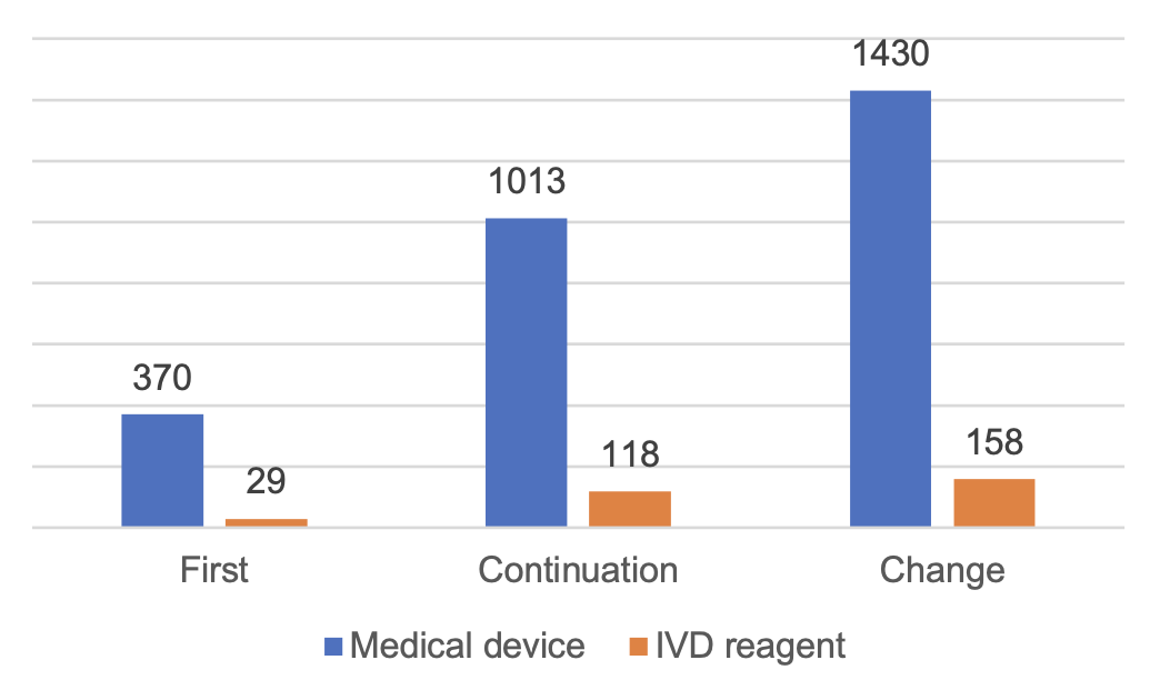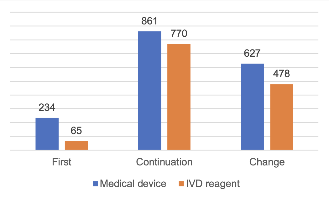 According to the registered species, 9,968 applications for registration of medical devices and 3,292 applications for registration of in vitro diagnostic reagents. Distinguished by the form of registration, the applications for first registration are 3,559, accounting for 27% of all medical device registration applications; continuation of registration application 4,676, accounting for 35%; change of registration application 5,025, accounting for 38%.