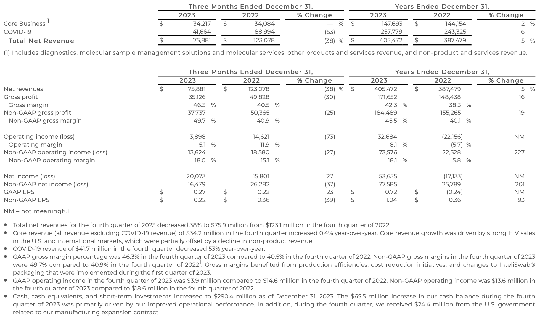 ¡°We made meaningful progress on our transformation journey in 2023. We generated significant positive operating cash flow with margin expansion, driven by our enterprise-wide focus on innovating and operating with disciplined execution. We expect to deliver additional productivity gains across our organization, and we are on track to achieve our target of break-even in cash flow from operations for the core business by the end of 2024,¡± said OraSure President and CEO Carrie Eglinton Manner.