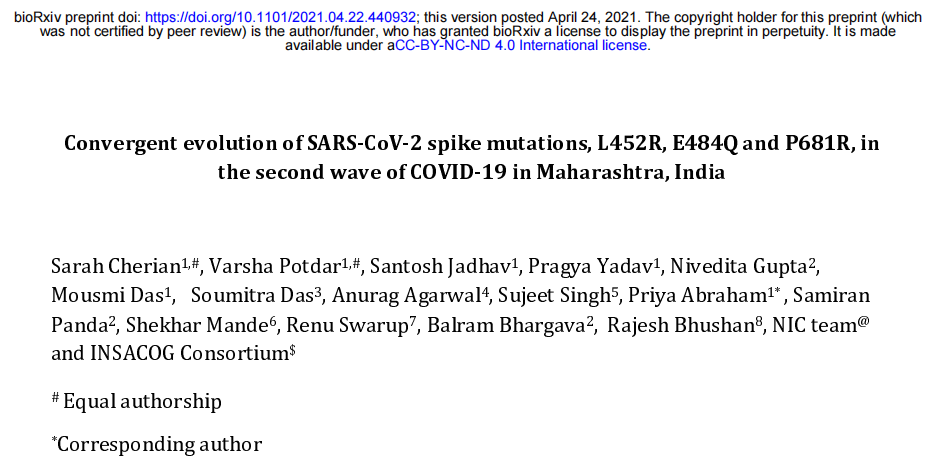 B.1.617 variant has become the main variant spreading locally in parts of India. Researchers sequenced the virus genome in samples from Maharashtra and found a unique combination of three mutations. It shows that COVID-19 is constantly evolving to escape the human immune system. B.1.617 variant carries three mutations in the S gene: L452R, E484Q, and P681R, which may lead to immune escape and enhanced its infectivity.