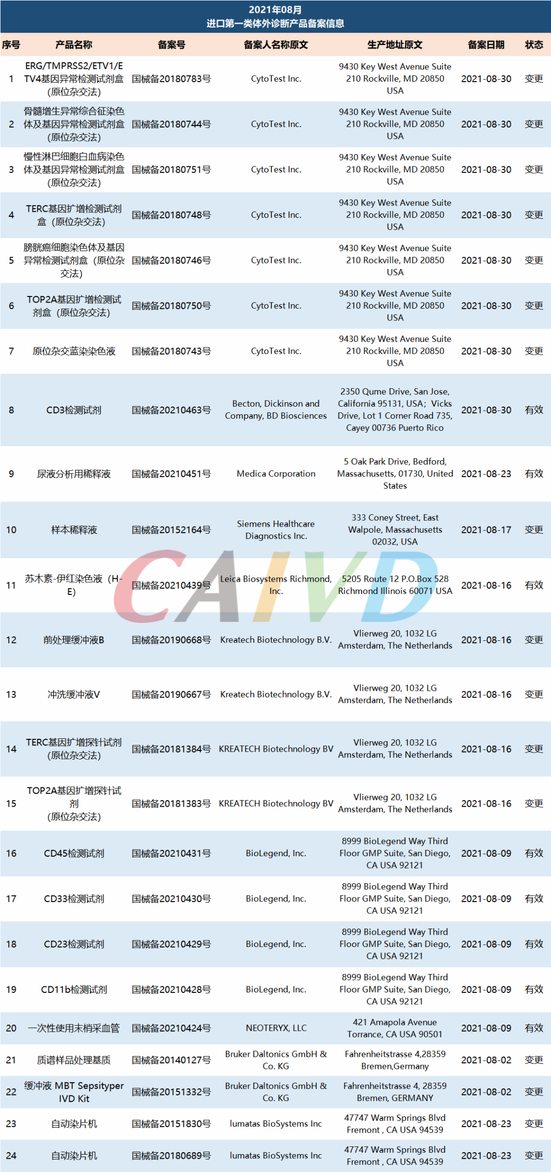 2021年8月,国家药品监督管理局共备案进口第一类医疗器械产品123个。其中,体外诊断产品24个,具体产品如下: