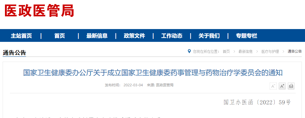 更新时间:2022/3/10 16:41:51 浏览次数:2963日前,国家卫健委发布成立国家卫生健康委药事管理与药物治疗学委员会的通知。加强医疗机构药事管理,促进合理用药,发挥专家技术支持作用。
