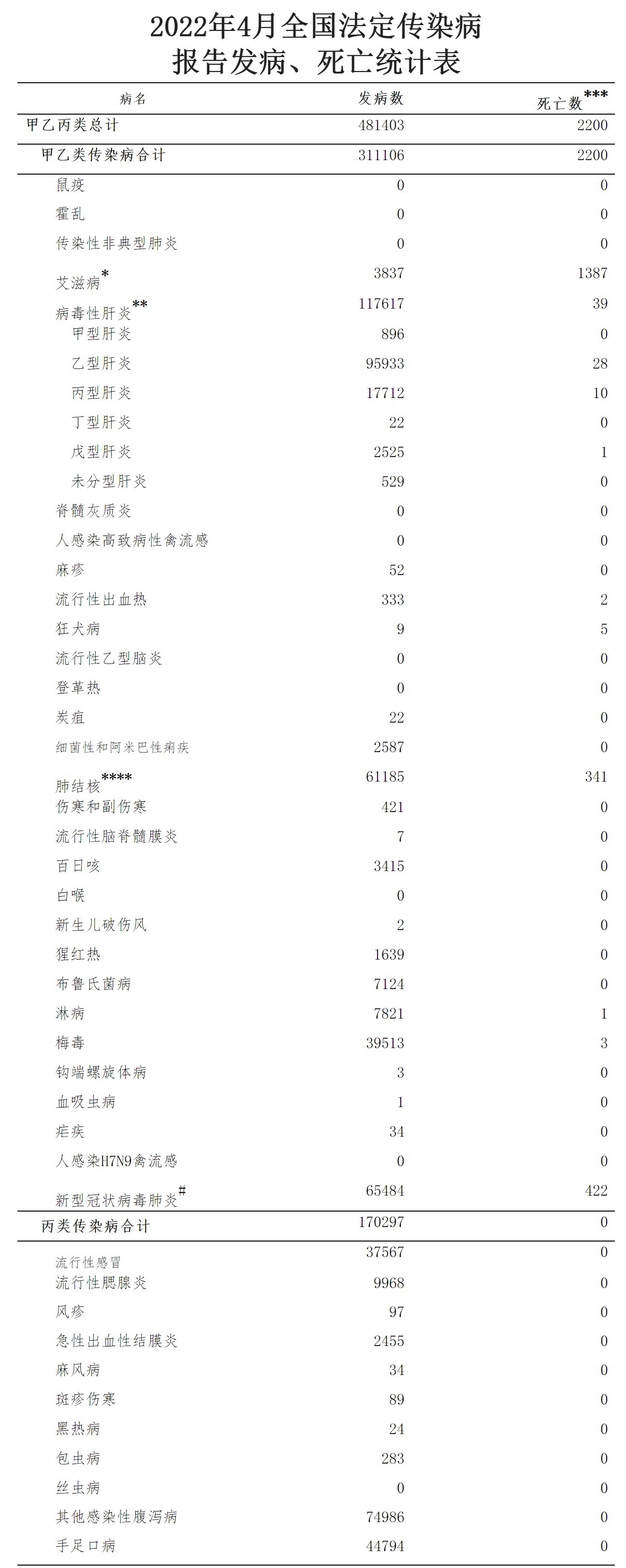 2022年4月全国共报告法定传染病481403例,死亡2200人