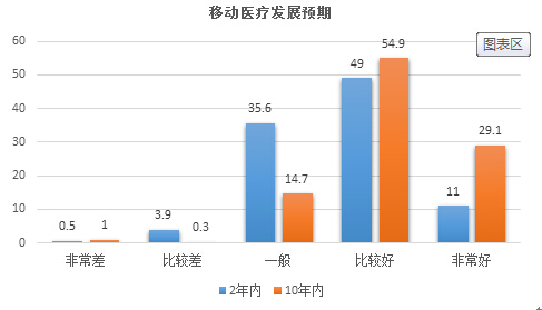 数据显示,49%受访者认为两年内中国移动医疗有比较好的发展,54.9%的受访者认为10年内移动医疗有比较好的发展;另外,相比较11%的受访者认为2年内中国移动医疗发展会非常好,更多的受访者(29.1%)认为移动医疗10年内在中国会发展的非常好。
