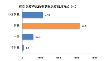 数据显示,63.3%的受访者同意移动医疗将改变人们对医疗信息的获取方式,22.8%的受访者非常同意移动医疗将改变人们对医疗信息的获取方式。