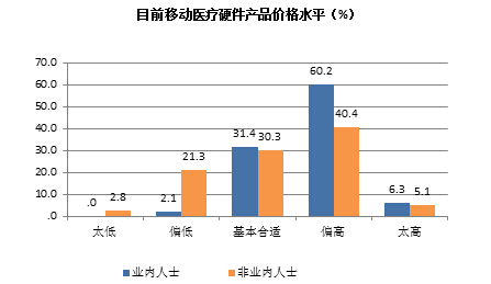 这一现象可能与业内人士对移动医疗硬件成本及应用功能相对比较了解,因此对其价格水平期望值相对比较低。