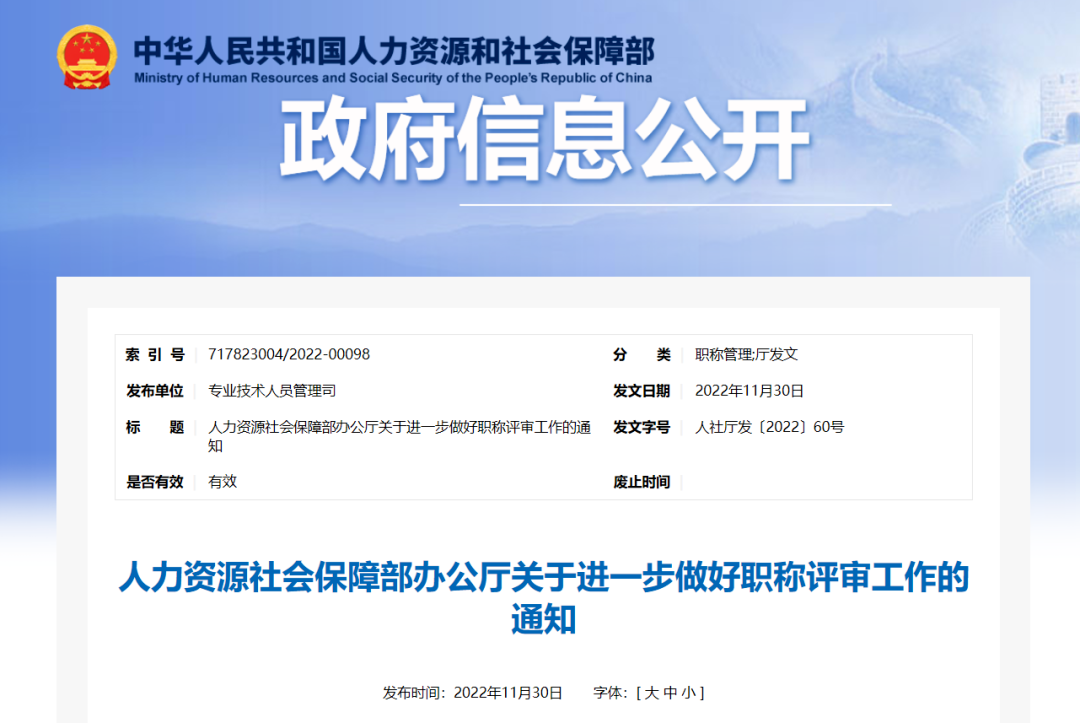 随后,在2022年11月30日,国家人力资源社会保障部办公厅印发了《关于进一步做好职称评审工作的通知》,明确持续推动职称评审破“四唯”、立“新标”是进一步深化职称制度改革的重要举措。