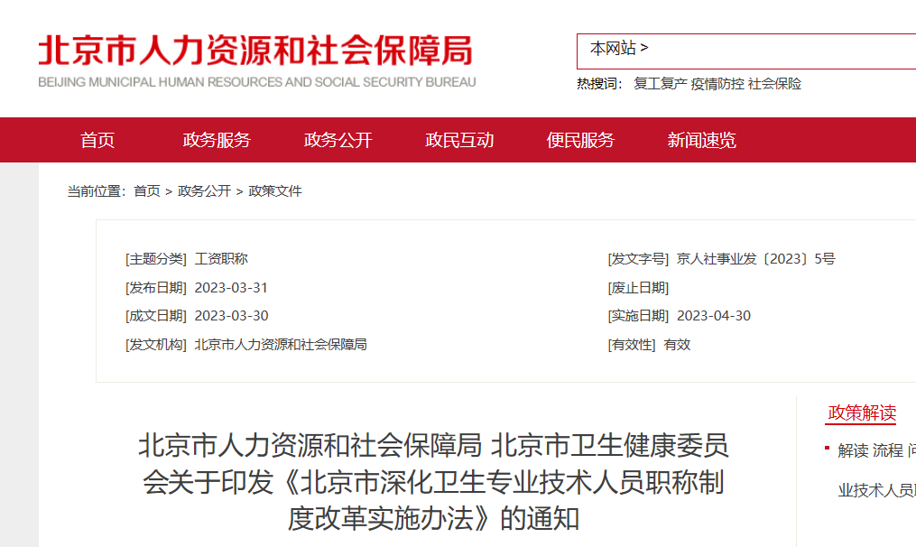 更新时间:2023/4/7 14:43:58 浏览次数:221573月31日,北京市卫生健康委员会、北京市人力资源和社会保障局联合发布了《北京市深化卫生专业技术人员职称制度改革实施办法》。