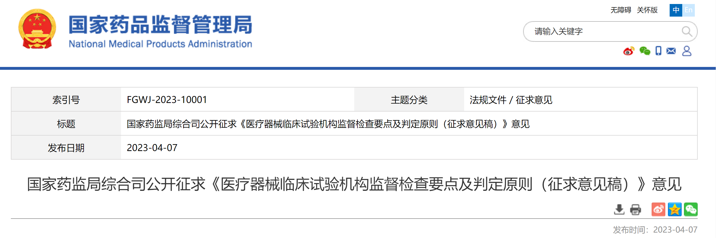 国家药监局综合司公开征求《医疗器械临床试验机构监督检查要点及判定原则(征求意见稿)》意见