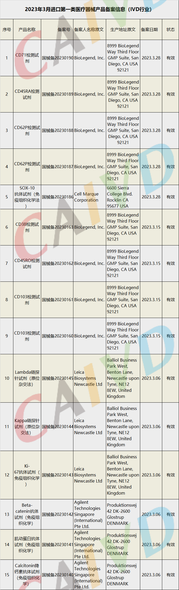 4月13日,国家药品监督管理局公布了2023年3月进口第一类医疗器械产品备案信息,本次公布了145条备案信息,其中IVD行业共有15项,详见下表。