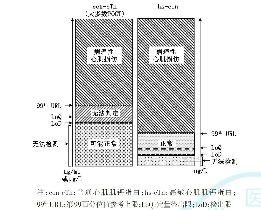 5.99th URL:指将表观健康人的cTn浓度值从小至大排列,处于第99位(具体为第99位与第100位的均值)的cTn浓度值称为表观健康人第99百分位值。由于cTn是一个连续变量,不存在完全区分正常和心肌梗死的单一切点值,因此将表观健康人99th URL作为公认的医学决定限,以前的目的是减少假阳性率,现在是要早期发现AMI和能发现(检出)微小的AMI,这必将缩小AMI临床诊断与病理学诊断间的差距,有利于临床提前干预,使患者获益[4]。现阶段根据检测性能将cTn检测方法大致分为两类:即高敏和普通,后者包括绝大部分POCT检测方法(图2)。两类检测方法的主要区别是:第99百分位值处总CV和健康人群中能检出超过LoD的比例。(1)hs-cTn检测法:检测性能要求:①在不少于50%的健康男性和女性人群中均能够稳定可靠地检测到cTn,并且cTn浓度等于或高于LoD;②在性别特异性99th URL浓度下的总CV≤10%。(2)普通心肌肌钙蛋白(con-cTn)检测法:检测性能要求:①在20%~50%健康人群中能够检测到cTn,并且cTn浓度等于或高于LoD;②99th URL浓度下的总CV≤10%(由于检测敏感性不够,故不具备分设男女99th URL的能力)为指南可接受,总CV≤20%为临床可接受。(3)POCT心肌肌钙蛋白检测法(POCT-cTn):POCT主要特点是及时、即地,且可由非检验专业人员操作。需注意绝大多数POCT-cTn在正常人群中检出率都非常低,且99th URL浓度下的CV较大。根据2018版AMI通用定义,20%的cTn水平变化是鉴别急性和慢性心肌损伤的关键,因此99th URL浓度下的总CV≤20%为临床可接受,如果CV>20%则不可接受(容易造成假阴性或假阳性)。