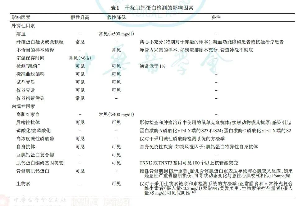 1.干扰肌钙蛋白检测的因素:任何抗原-抗体反应均不可避免会出现假阳性或假阴性。尽管大多数现代免疫检测试剂内包含了非特异性免疫球蛋白封闭剂减少干扰的影响,但并不能完全避免。hs-cTn分析技术十分敏感,稍有问题即可对检测结果带来较大影响,尤其对低水平的危害更大,较小浓度变化(如2~6 ng/L)会导致不同的临床结局。