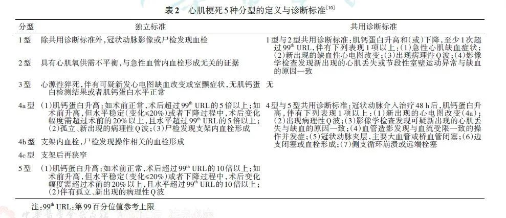 1.AMI诊断:需要强调cTn高于99th URL是诊断AMI的必要条件,但不是唯一条件。临床诊断AMI必须有临床缺血证据支持,无临床缺血证据的cTn急性升高或降低,不能诊断为AMI。在数小时或数天内动态监测cTn变化在诊断AMI中也非常重要,升高或降低的变化在诊断AMI中的临床意义是一致的,取决于采血的时机。应用hs-cTn变化值诊断AMI时,绝对变化优于相对变化[16]。连续监测时,hs-cTn表现为升高还是下降取决于采血时机和病程,通常AMI发生时,hs-cTn快速升高,然后缓慢下降,其幅度部分取决于血管闭塞情况和梗死面积[17, 18]。2018年第4版全球AMI通用定义中的5种类型AMI诊断标准详见表2。AMI诊断标准包括:cTnT或cTnI(首选hs-cTn)水平升高和(或)降低,且至少有1次超过健康人99th URL,并伴有至少1种临床缺血证据:(1)急性心肌缺血的症状;(2)新发心电图缺血性改变;(3)心电图出现病理性Q波;(4)影像学证据显示存活心肌丢失或与缺血原因一致的节段性室壁运动异常;(5)血管造影或尸检发现冠状动脉内血栓[10]。