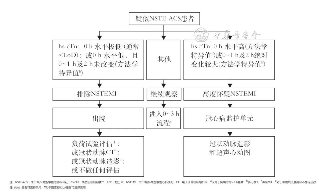 【推荐意见8】(1)所有疑似ACS患者均应检测cTn,不同的诊断流程需要选择特异性的诊断方法和界值。(2)0~1、0~2、0~3 h的快速诊断流程应采用hs-cTn检测方法,并进行临床验证。(3)单次检测hs-cTn低于LoD可安全排除胸痛时间超过3 h患者的AMI风险。(4)单次检测con-cTn阴性,或低于LoD不可直接排除AMI,应在6 h后再次检测,观察其变化。
