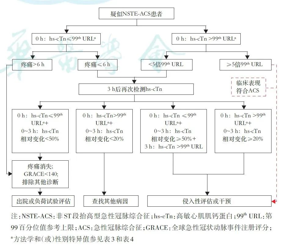 2.非ST段抬高AMI诊断:所有可疑ACS的患者均应该测定肌钙蛋白,首选高敏肌钙蛋白,其敏感性和特异性显著优于肌酸激酶(CK)、肌酸激酶同工酶(CK-MB)、肌红蛋白(Myo)、心型脂肪酸结合蛋白(h-FABP)及和肽素(Copeptin)[11,19, 20, 21]。症状出现后cTn可快速升高并持续数天,尤其hs-cTn水平通常在症状出现后1 h内即可升高。连续采血动态监测肌钙蛋白浓度变化是诊断非ST段抬高AMI的重要手段。与con-cTn相比,hs-cTn可显著提高早期胸痛患者诊断精确性。hs-cTn替代con-cTn用于急诊疑似非ST段抬高型ACS患者诊断时,可提高非ST段抬高型AMI诊断率(1型心肌梗死相对增加约20%,2型心肌梗死相对增加200%),不稳定心绞痛(UA)诊断的比例减少,同时伴随更低的死亡风险。