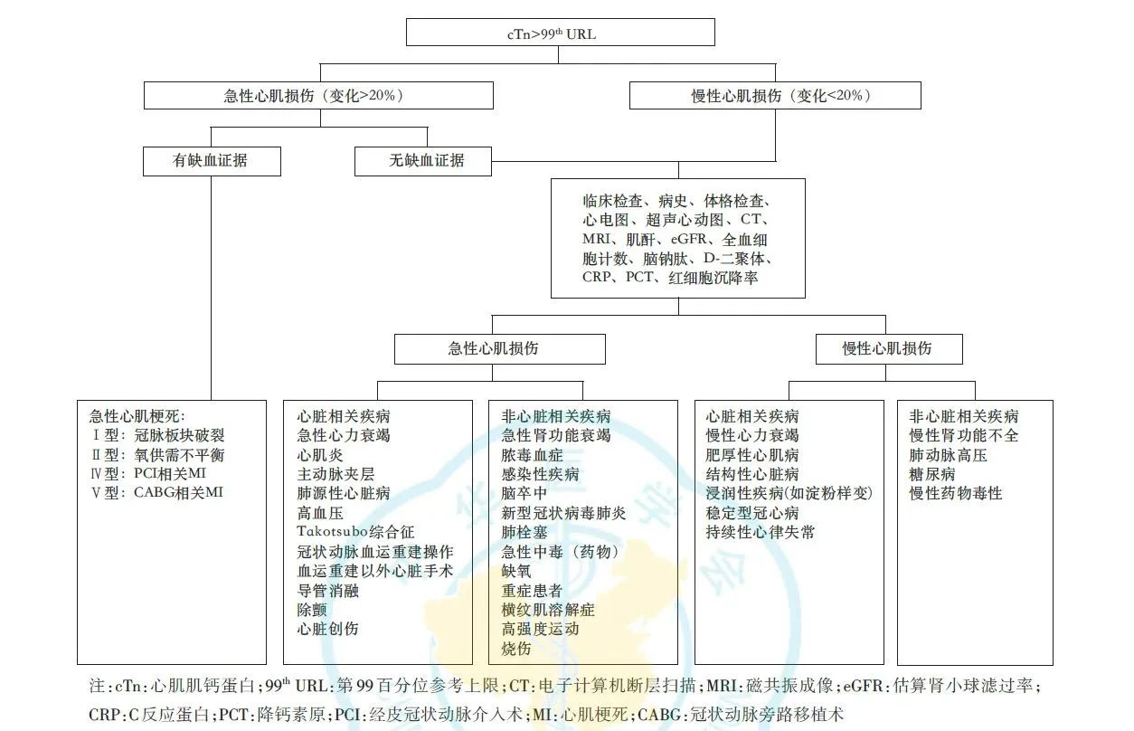 心肌损伤的诊断标准:cTn高于99th URL诊断为心肌损伤,如果伴随着上升或下降考虑为急性心肌损伤;如持续升高状态,且增幅变化<20%则可能为慢性心肌损伤。心肌损伤可见于多种心脏和非心脏疾病(图5)。