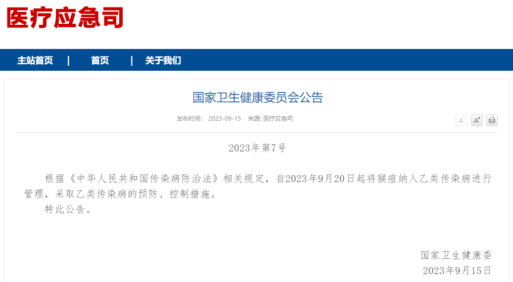 国家卫健委:9月20日起将猴痘纳入乙类传染病管理