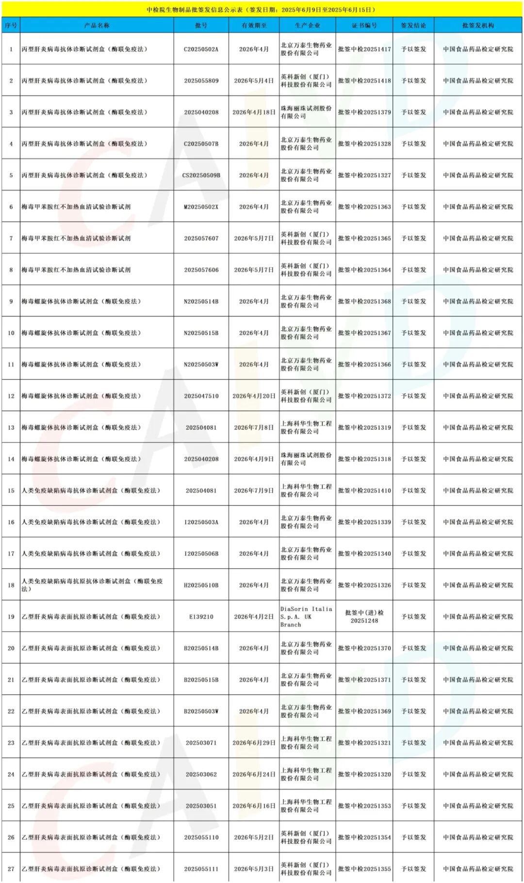 39款IVD产品获批!中检院生物制品批签发信息公示表(签发日期:2025年6月9日至2025年6月22日)