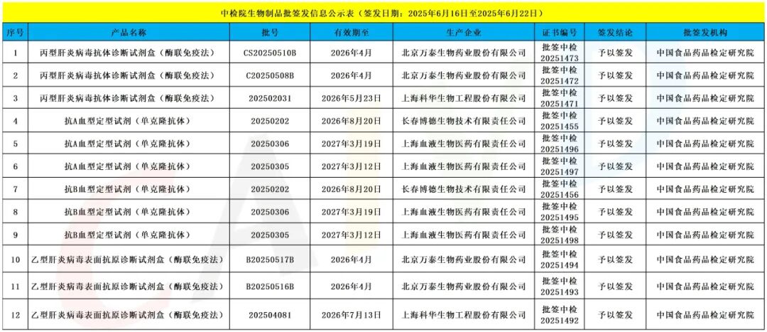 6月24日,中国食品药品检定研究院发布中检院生物制品批签发信息公示表(签发日期:2025年6月16日至2025年6月22日)其中体外诊断产品有12款。具体如下: