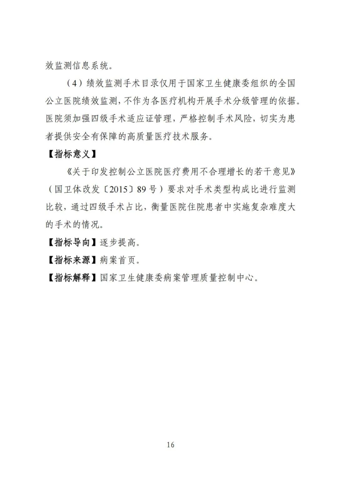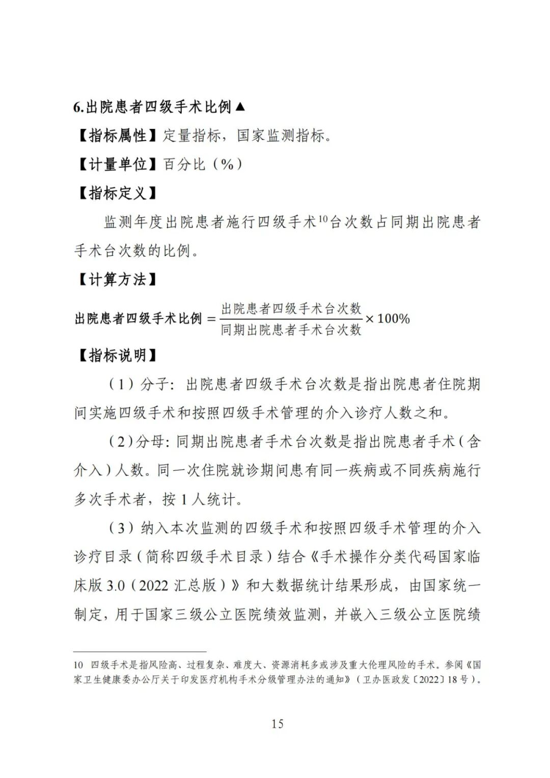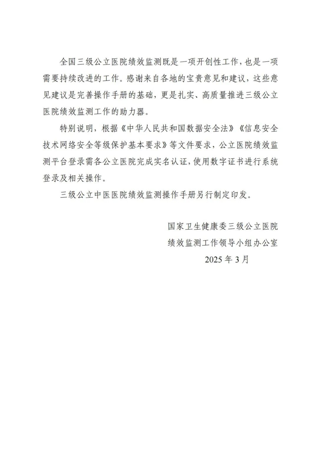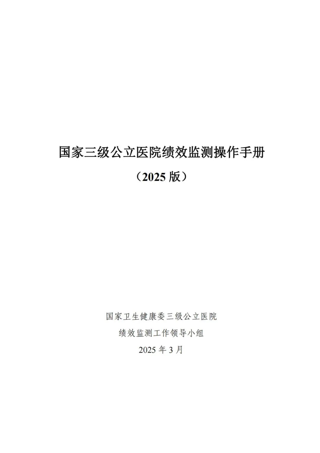 为贯彻落实《国务院办公厅关于加强三级公立医院绩效考核工作的意见》(国办发〔2019〕4号),持续提高三级公立医院绩效监测工作精细化水平,我委根据实际工作需要和最新政策文件要求,对《国家三级公立医院绩效考核操作手册(2024版)》进行了修订完善,形成了《国家三级公立医院绩效监测操作手册(2025版)》(可从国家卫生健康委网站下载)。现印发给你们,请遵照执行。