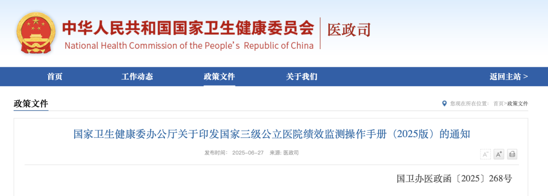 《国家三级公立医院绩效监测操作手册(2025版)》发布