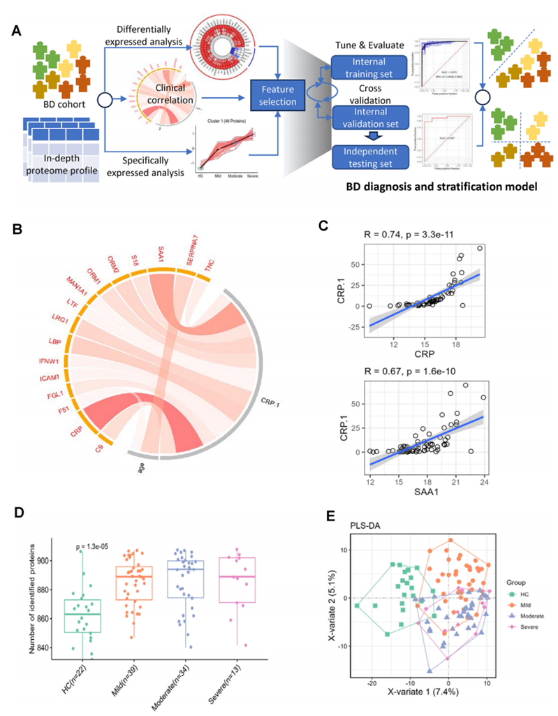 研究通过 DIA-MS 和工业化蛋白质芯片技术,对健康对照(HC)及轻、中、重度 BD 患者样本进行检测得到蛋白谱,之后对几种急性期反应物进行了相关性分析,结果显示急性时相反应蛋白与临床检测结果呈显著正相关,验证了蛋白质组学平台的可靠性。PLS-DA 分析显示,HC 组可与 BD 患者明显区分,轻度 BD 患者也能与中重度患者部分区分,但中重度组间无显著差异。