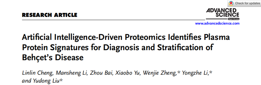 Cheng L, Li M, Bai Z, Yu X, Zheng W, Li Y, Liu Y. Artificial Intelligence-Driven Proteomics Identifies Plasma Protein Signatures for Diagnosis and Stratification of Behçet's Disease. Adv Sci (Weinh). 2025 Jun 23:e10061. doi: 10.1002/advs.202510061 . Epub ahead of print. PMID: 40549882.
