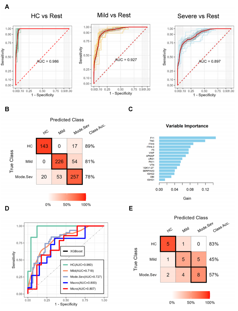 研究对不同疾病严重程度的组别进行差异分析识别了用于区分BD分层的循环蛋白特征。训练集区分 HC 与 BD、轻度与其他组、中重度与轻度的 AUC 分别为 0.986、0.927、0.897。