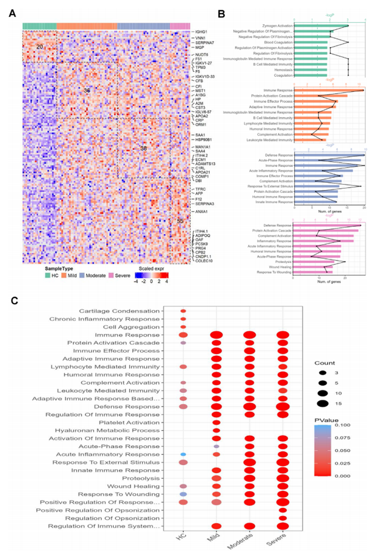 研究通过方差分析,确定了在HC组、轻度BD组、中度BD组和重度BD组中分别有20种、36种、38种和56种蛋白质显著过表达(图3A)。功能注释显示,轻度BD组中高表达的蛋白质主要集中在免疫反应、蛋白质激活级联反应和免疫效应反应。在中度BD组中,高表达的蛋白质主要参与防御反应、急性期反应。在重度BD组中,富集的蛋白质主要与蛋白质激活级联反应与补体激活(图3B)。图3C进一步展示了各途径对不同疾病严重程度的影响,显示免疫反应、防御反应、对外部刺激的反应和蛋白水解与疾病严重程度显著相关。此外,在重度组这些途径随着疾病严重程度的增加而逐渐上调。
