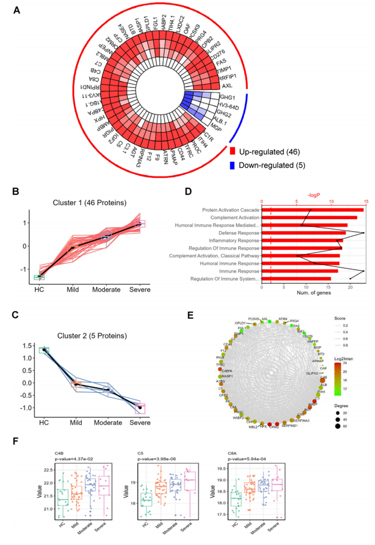 研究使用基因集富集分析(GSEA),表征了与BD发病机制相关的蛋白质的功能富集。结果显示,在BD患者中上调的蛋白质中,最显著的三个富集通路是金黄色葡萄球菌感染、血小板激活和补体及凝血级联反应。研究通过单样本ssGSEA和表达趋势分析进一步发现了与BD疾病进展相关的通路,包括补体及凝血级联反应、抗原处理与呈递、血小板激活在内的55个通路与疾病进展相关。共有46种蛋白质与疾病的严重程度呈正相关,随着病情加重,这些蛋白质的表达逐渐增加;而5种蛋白质则随着病情恶化表现出逐渐减少的趋势(图5A-C)。功能注释显示,与疾病严重程度相关的上调蛋白质主要参与了蛋白质激活级联反应、补体激活和体液免疫反应(图5D)。