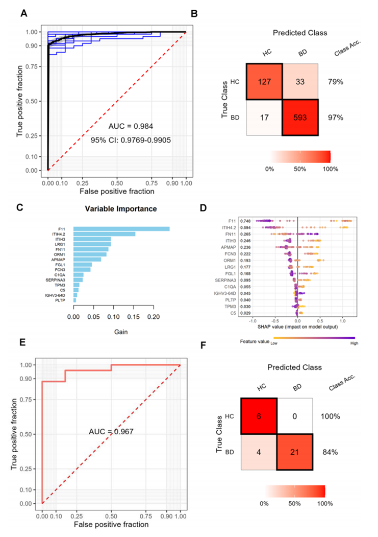 研究通过机器学习算法对差异表达的蛋白组数据进行分析,在训练集中,模型达到了0.984的曲线下面积(AUC)和0.935的准确率(图2A,B)。通过基于XGBoost的模型,我们确定了F11、ITIH4、SERPINA3、APMAP、ORM1、LRG1、ITIH3、FN1、FGL1、FCN3、C1QA、C5、PLTP、TPM3和IGKV3- 64D等关键生物标志物,这些标志物被认为是BD诊断的关键变量(图2C,D)。这些发现通过独立队列的外部验证得到了进一步确认,验证结果表明AUC为0.967,准确率为0.871(图2E,F)。总体而言,这些结果展示了工业化智能蛋白质芯片平台在BD诊断中的巨大潜力。