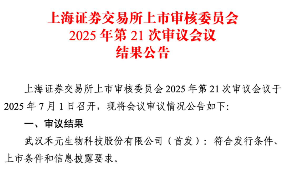 更新时间:2025/7/3 17:32:01 浏览次数:15717月1日晚,上交所官网发布信息,武汉禾元生物科技股份有限公司IPO申请通过上交所上市审核委员会审议,成为科创板第五套上市标准重启后首家过会的IPO企业,有望成为光谷第70家上市公司。
