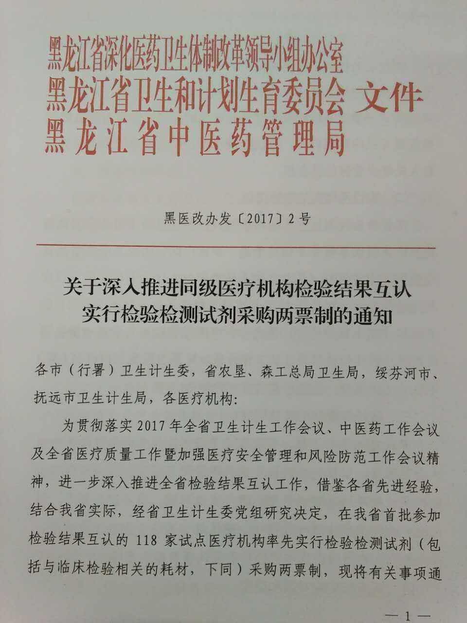 实行检验检测试剂采购两票制,主要是根据《国务院深化医药卫生体制改革领导小组关于进一步推广深化医药卫生体制改革经验的若干意见》、《黑龙江省人民政府办公厅关于印发黑龙江省深化医药卫生体制改革2016年重点工作任务的通知》、《黑龙江省卫生和计划生育委员会、黑龙江省中医药管理局关于进一步推进同级医疗机构检验结果互认工作的通知》(黑卫医发[2016]217号)等有关文件精神,及参照其它省市的做法。