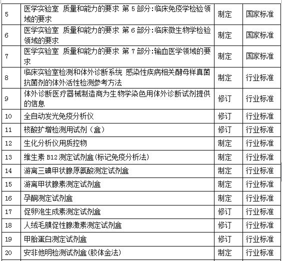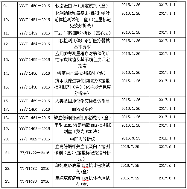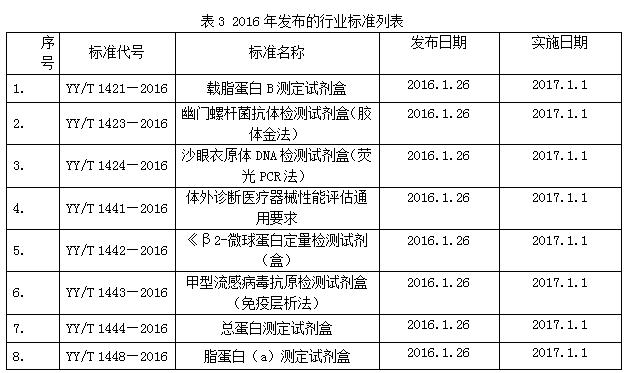 2016年国家食品药品监督管理总局发布2016年第25号文、第74号文和第129号文,共发布了23项体外诊断产品相关行业标准,见表3。