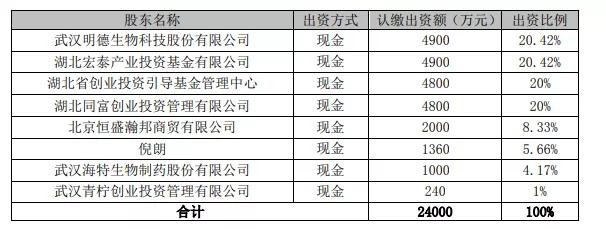 湖北青柠基金注册资本为人民币 2.4 亿元,明德生物拟以自有资金认缴出资人民币 4,900 万元参与设立湖北青柠创业投资基金有限公司。各股东的认缴出资金额、出资方式和出资比例见下图: