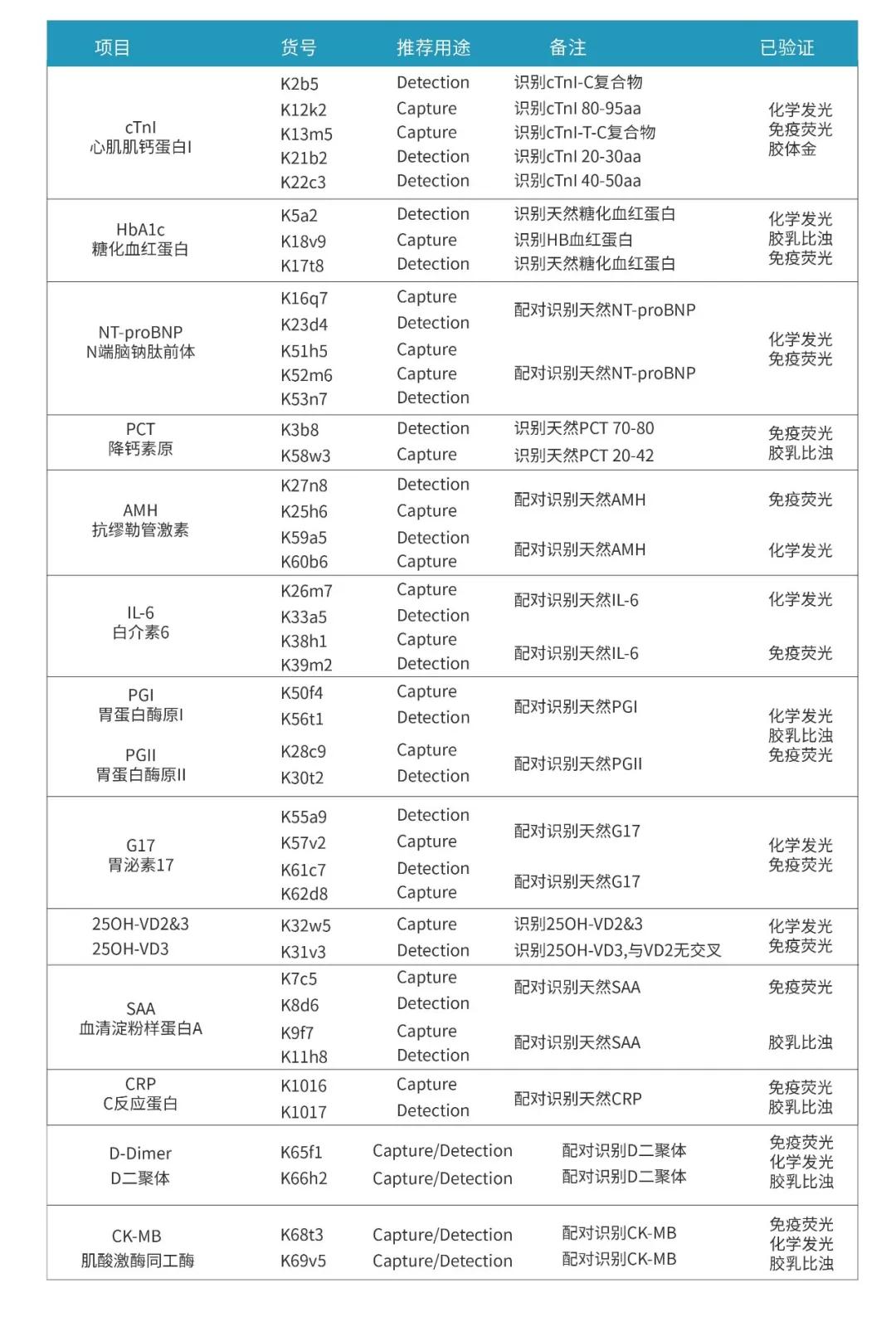 欧凯生物单抗均来源于细胞体外培养,无鼠源抗体污染,无动物蛋白污染。抗体产品应用于免疫层析、胶体金、化学发光、免疫比浊等诊断平台,在线性、特异性、灵敏度、稳定性等评估上表现出良好的性能。