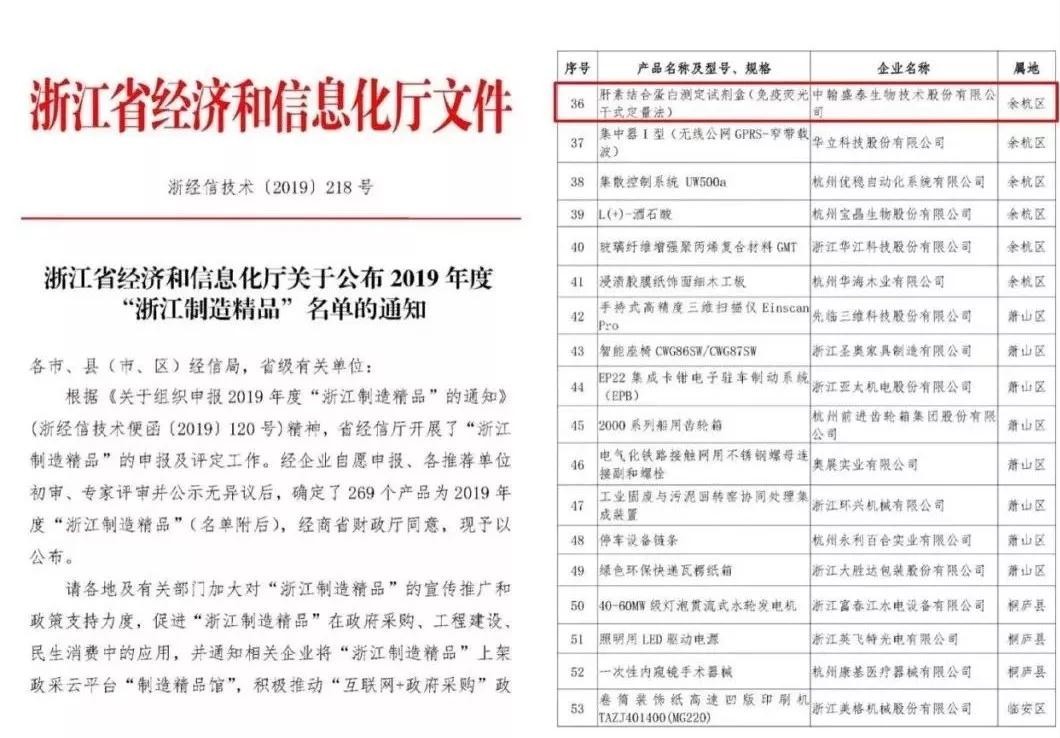 中翰盛泰肝素结合蛋白检测试剂盒入选2019年度“浙江制造精品”名单