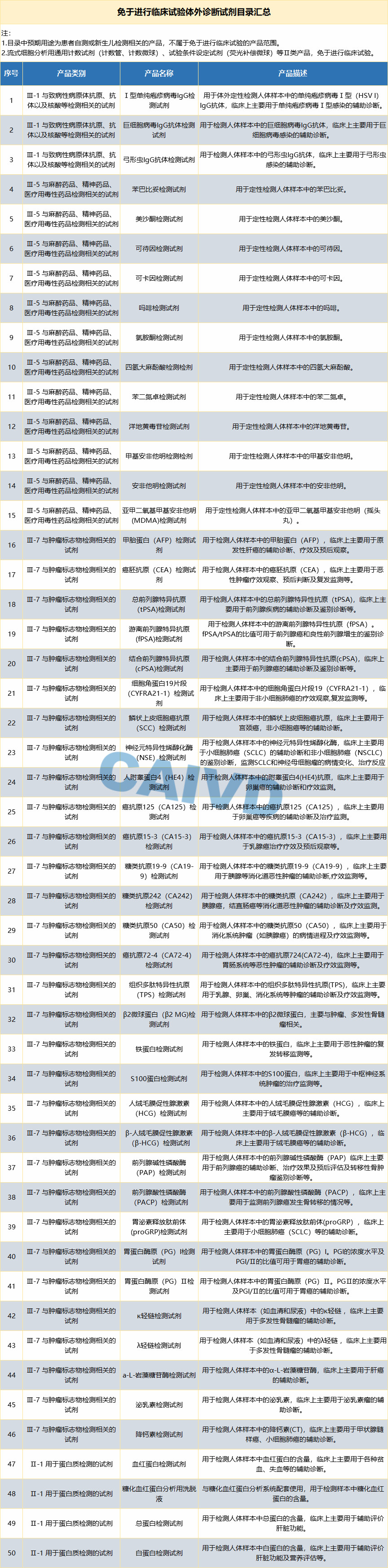 时至今日,免于进行临床试验医疗器械产品涵盖1003项,其中体外诊断仪器产品达54项;体外诊断试剂产品共416项。详细信息如下: