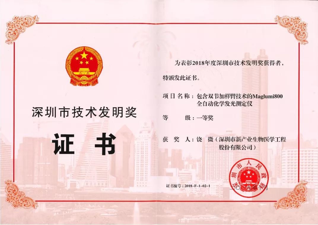 近日,深圳召开全市科学技术奖励大会,隆重表彰为深圳科技创新发展作出突出贡献的单位和个人,发出新一年创新发展的动员令。奖励大会上,华为、新产业生物等企业代表就坐于首排,新产业生物依靠“包含双节加样臂技术的Maglumi 800全自动化学发光测定仪”获得2018年度深圳市技术发明奖一等奖的荣誉。