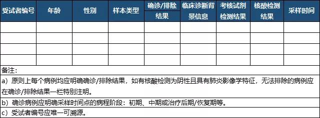 此外还应纳入部分新型冠状病毒感染的肺炎患者不同时间采集的连续样本,包含该病例新型冠状病毒核酸和抗原/抗体由阴性转为阳性的各阶段样本。