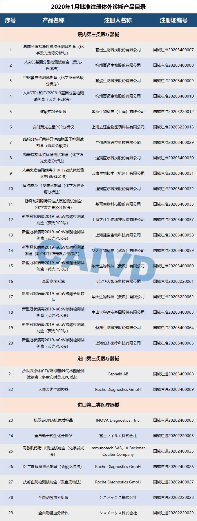 1月,国家药品监督管理局共批准注册医疗器械产品120个。其中,体外诊断产品共计29个:境内第三类体外诊断产品20个,进口第三类体外诊断产品2个,进口第二类体外诊断产品7个(具体产品见下图)。