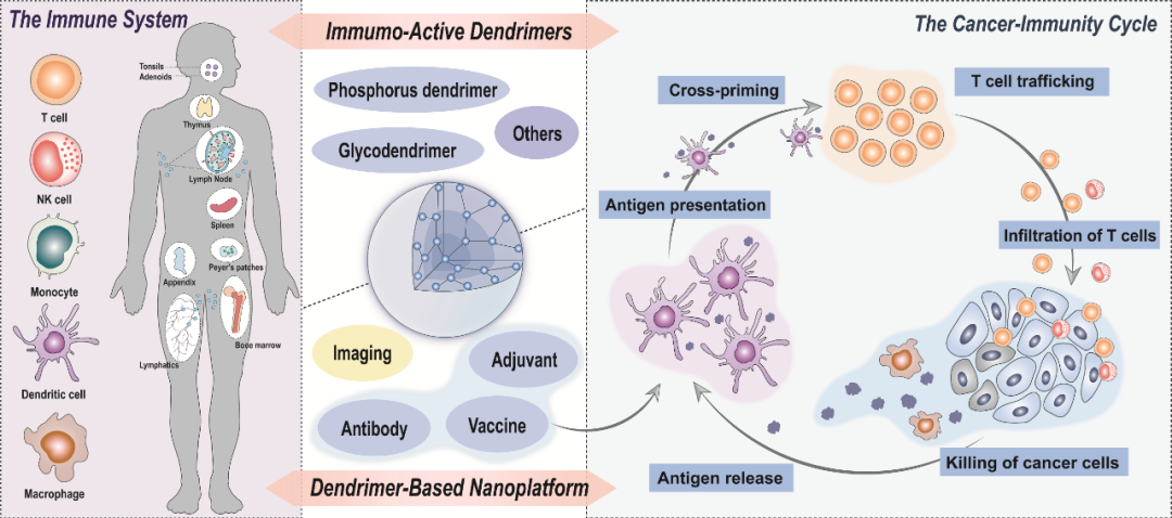 免疫治疗已然成为一大新兴的肿瘤应对策略。不同于传统的手术、放疗和化疗,免疫治疗通过激活病人的免疫系统,依靠自身免疫机能杀灭癌细胞和肿瘤组织,能够进行精准的免疫杀伤,其特异性高,毒性小,且具有免疫记忆杀伤效应。纳米诊疗技术的快速发展使得癌症高效免疫治疗具有更多的可能性。通过纳米平台的智能设计和应用,有望克服治疗过程中的免疫抑制,持续性地激活体内的肿瘤免疫循环,从而取得更好的治疗效果。在众多纳米材料中,树状大分子由于其物化性质独特而受到广泛关注,研究者已成功将其作为造影剂、治疗剂等的载体,构建多功能的诊疗一体化平台用于肿瘤的诊断和治疗。近年来的研究表明,树状大分子在免疫调节、免疫治疗以及免疫示踪方面也极具潜力。基于此,东华大学化学化工与生物工程学院史向阳教授课题组综述了近年来树状大分子在免疫治疗中的应用进展。